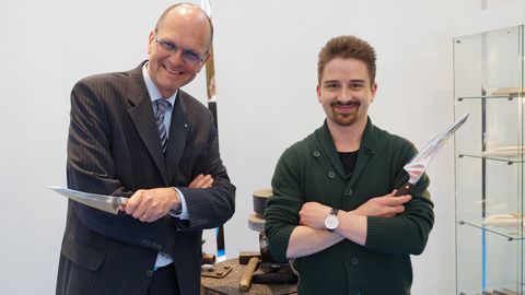 Hauptgeschäftsführer Dr. Joachim Eisert (links) und Janosch Vecernjes (rechts) mit zwei der scharfen Küchenmesser.
