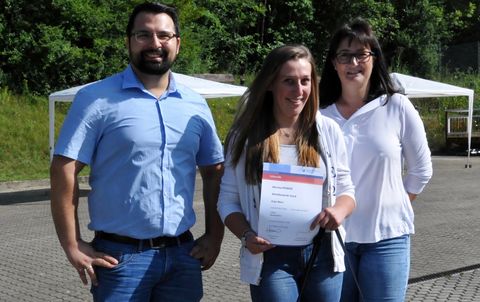 Siegerin Anja Nerz umrahmt von ihrem Lehrer Dervis Gülsoy und Michaela Lundt von der Handwerkskammer Reutlingen bei der Siegerehrung.